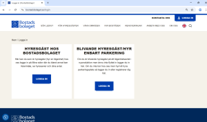 Du som hyr enbart parkering kan logga in på Mina sidor via hemsidan, men inte i appen. När du loggar in på hemsidan, välj alternativet Blivande hyresgäst/hyr enbart parkering (se bild nedan). Här loggar du enklas in med e-legitimation men det finns även möjlighet att logga in med personnummer och lösenord.