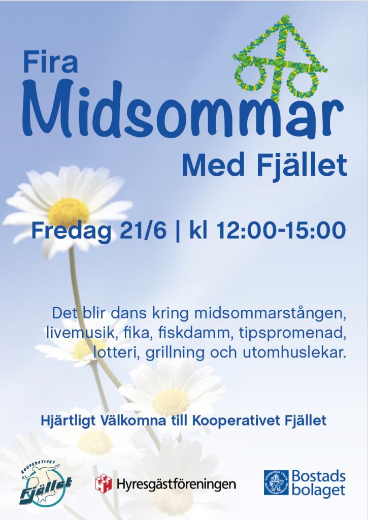 Det blir dans kring midsommarstången, livemusik, fika, fiskdamm, tipspromenad, lotteri, grillning och utomhuslekar.