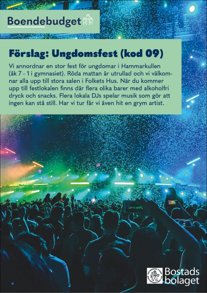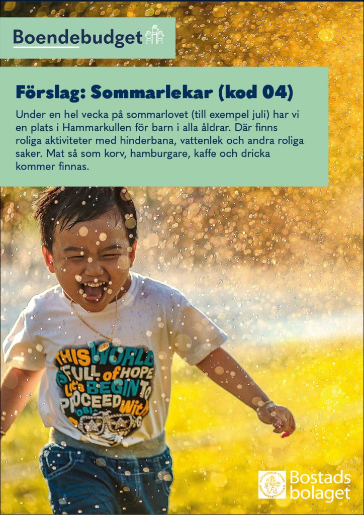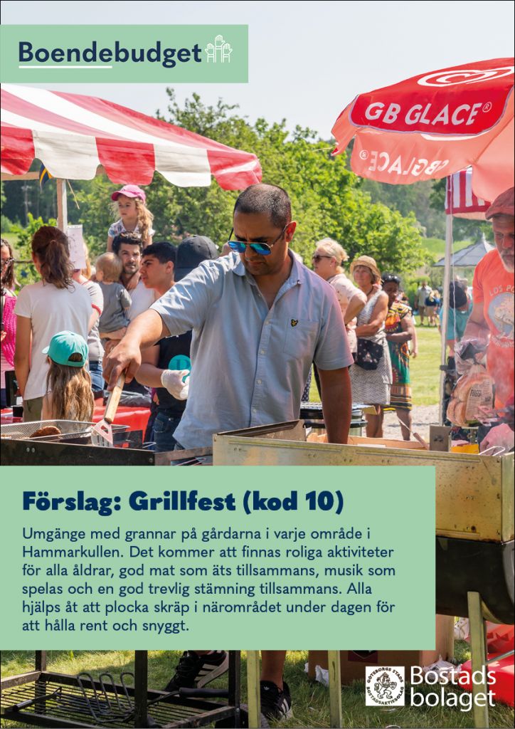 I Bostadsbolagets boendebudget får du som bor i Hammarkullen vara med och bestämma över en del av Bostadsbolagets pengar! Syftet är att öka demokratin och samtidigt skapa gemenskap mellan grannar.