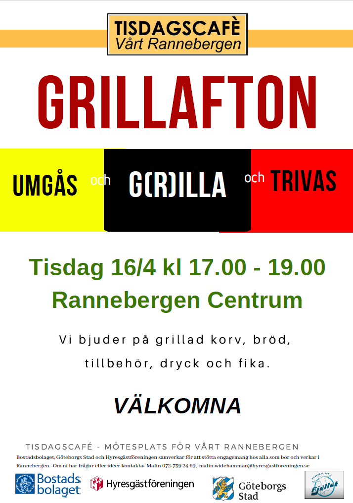 Tisdag den 16/4 klockan 17.-19 är du som bor i Rannebergen välkommen på grillafton på Rannebergens centrum.