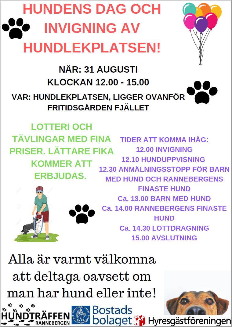 I somras färdigställdes hundlekplatsen i Rannebergen. Den har skapats på initiativ av boende i Rannebergen i samarbete med Hyresgästföreningen och Bostadsbolaget. Den drivs av föreningen Hundträffen och nu är det alltså dags för invigning. Under dagen koras Rannebergens finaste hund och det blir tävlingar, lotterier och mycket annat skoj.