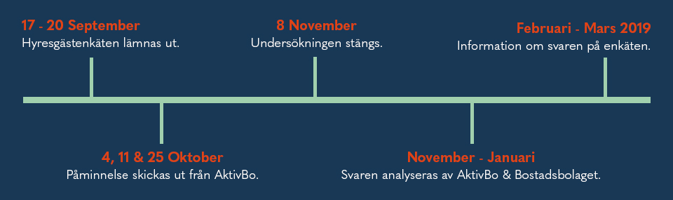 Den 17-20 september är det dags för oss att lämna ut 2018 års hyresgästenkät till hälften av er hyresgäster. Fick du inte svara på våra frågor förra året blir det din tur i år. Du som har din e-postadress registrerad hos oss får även den via mejl. Du kan välja att svara via pappersenkäten eller direkt på webben på www.svar.aktivbo.se.