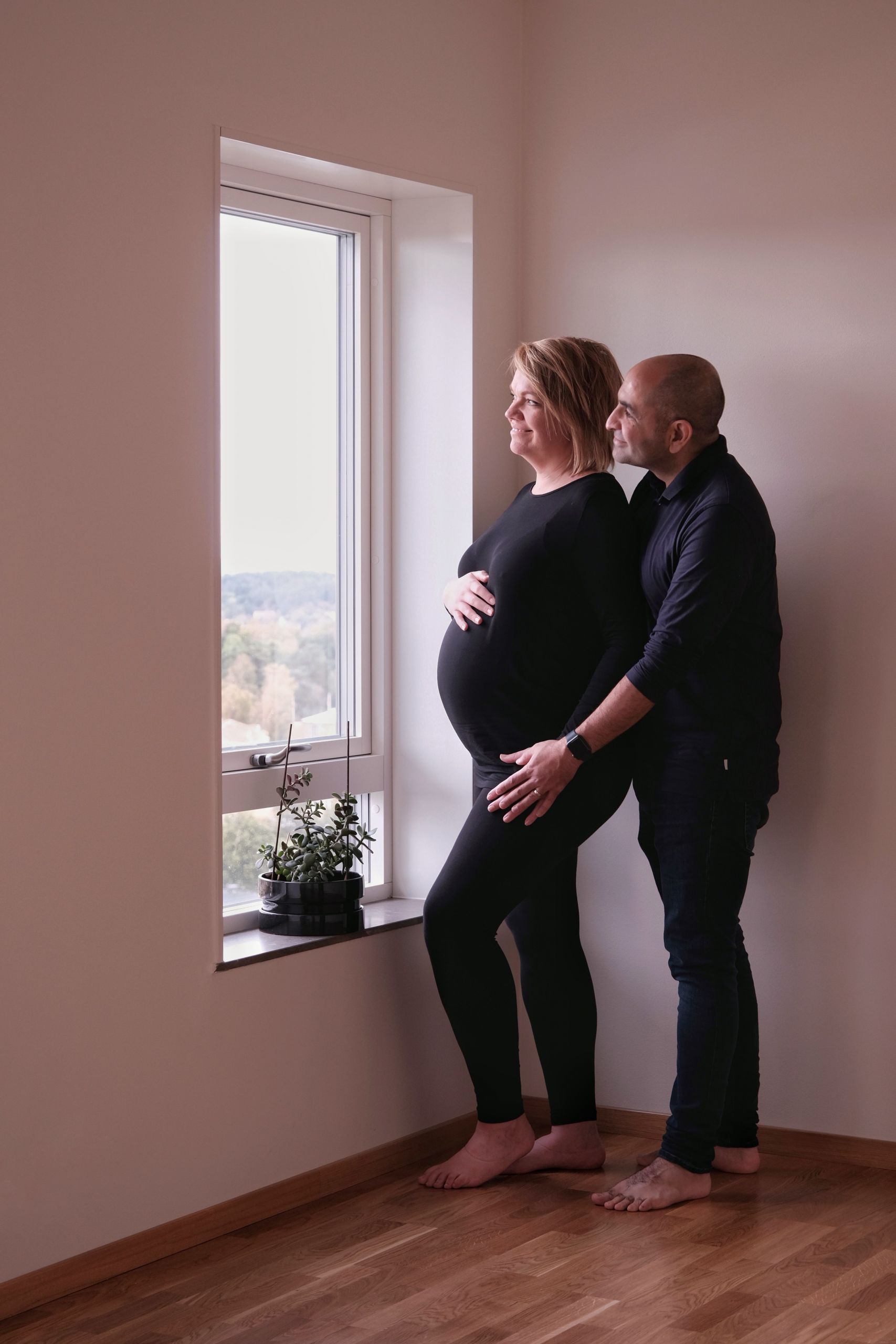 Farid och Katerina beundrar utsikten mot havet från sin nya lägenhet. Vilken dag som helst blir de föräldrar.
