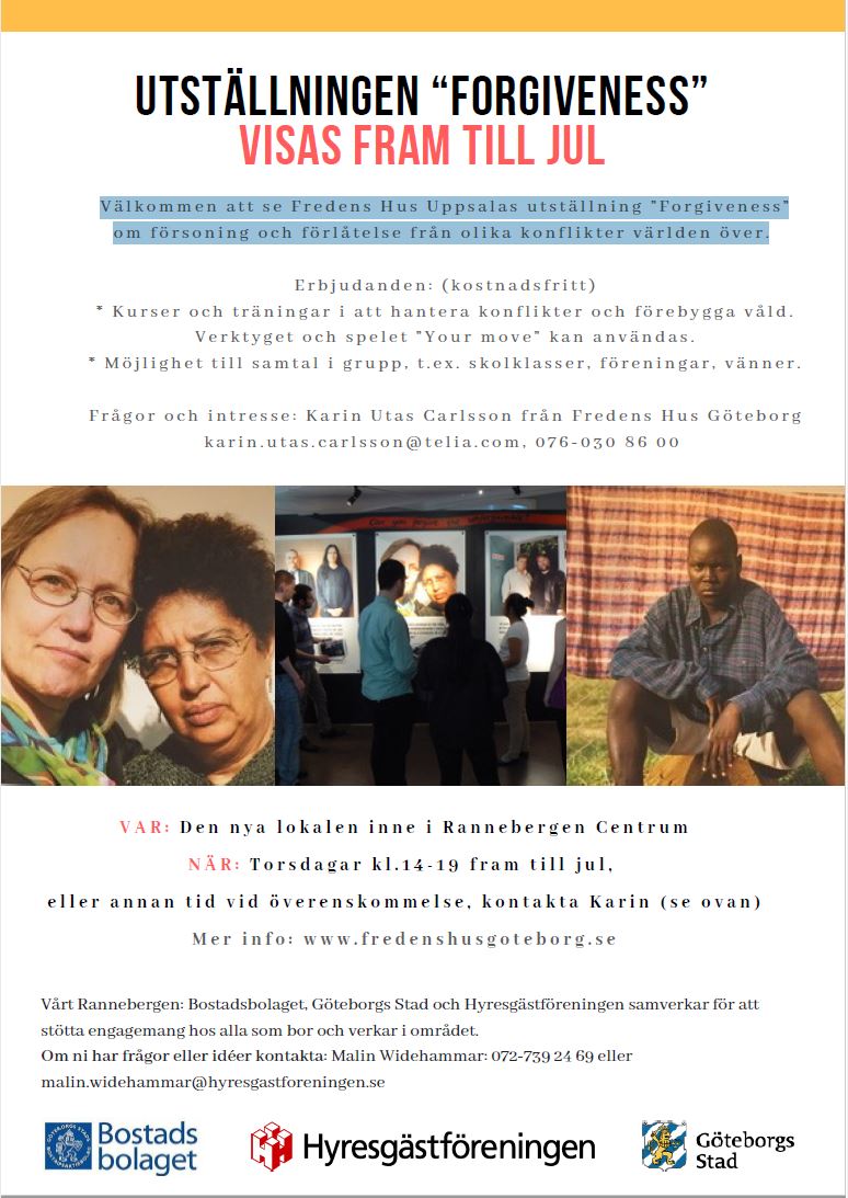 Välkommen till den nya lokalen i Rannebergens Centrum för att besöka utställningen Forgiveness, om försoning och förlåtelse från olika konflikter världen över.