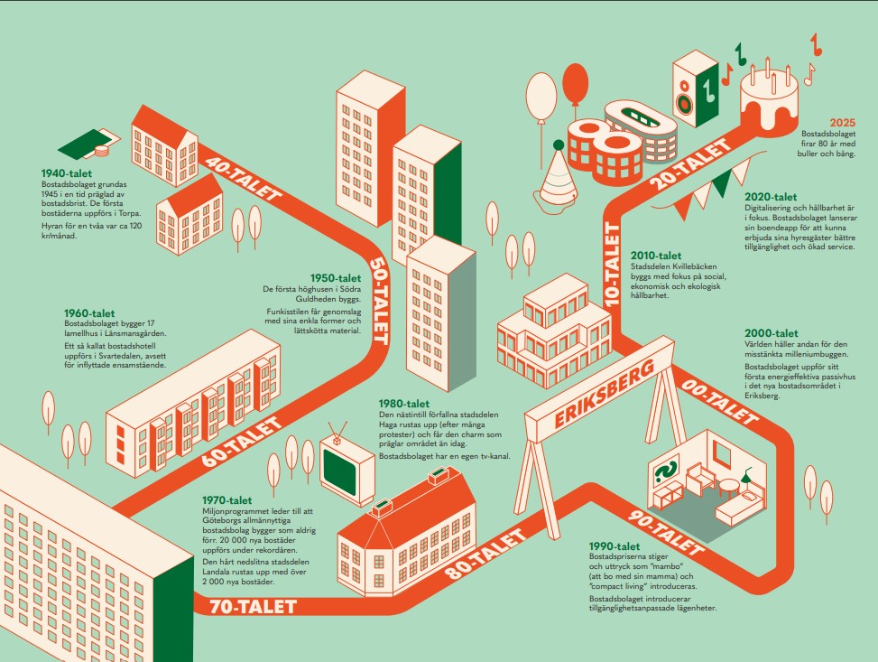 Det har hunnit gå 80 år sedan Bostadsbolaget grundades i en tid präglad av både bostadsbrist och framtidstro. Resan från 1945 till det Bostadsbolaget är idag är full av spännande anekdoter och milstolpar, men under jubileumsåret kommer man inte fokusera så mycket på att blicka bakåt. Med trygghet som tema för firandet vill man i stället sikta mot framtidens bostadsområden.