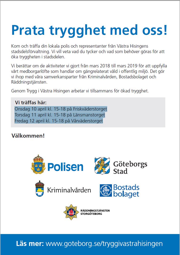 Under vecka 15 kan du som bor i Biskops- och Länsmansgården träffa din lokala polis och representanter från Västra Hisingens stadsdelsförvaltning. De vill veta vad du tycker och vad som behöver göras för att öka tryggheten i stadsdelen.