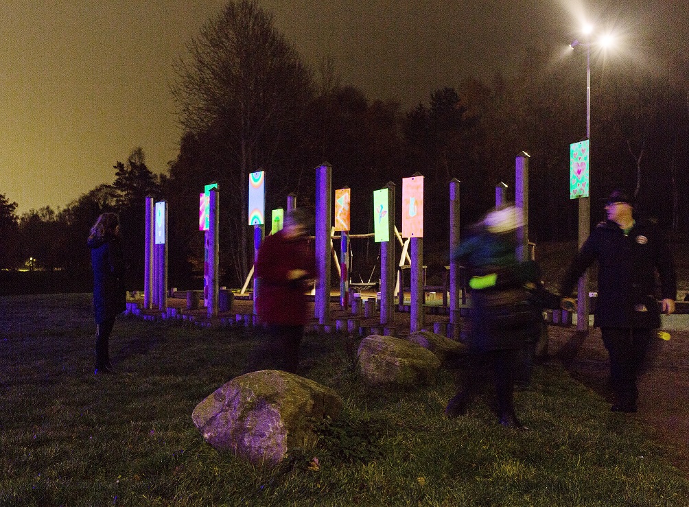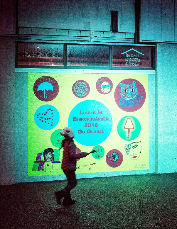 Det är invånarna själva som fått sätta färg och form på sitt område och uttrycka vad det bästa är med Biskopsgården. Det man jobbat fram under olika workshops har resulterat i ett antal ljusinstallationer längs en slinga runt Friskväderstorget och förbi Svarte Mosse.