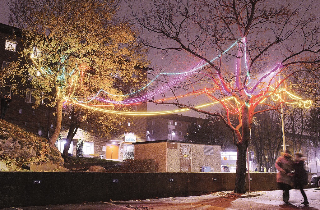 De boende i området har alltså skapat festivalens konstnärliga innehåll. Därefter har ljusdesignern Karin Jansson tolkat och omsatt det i fysiska installationer.