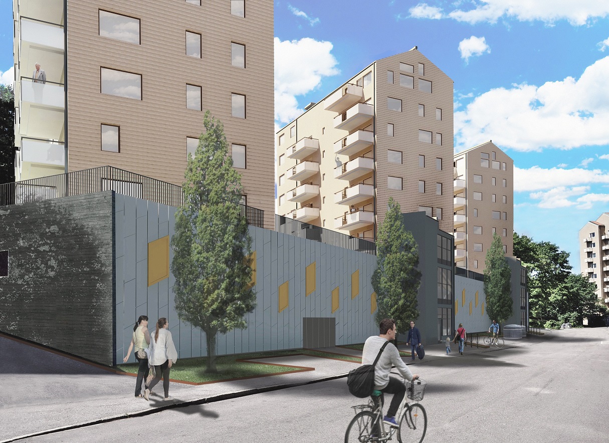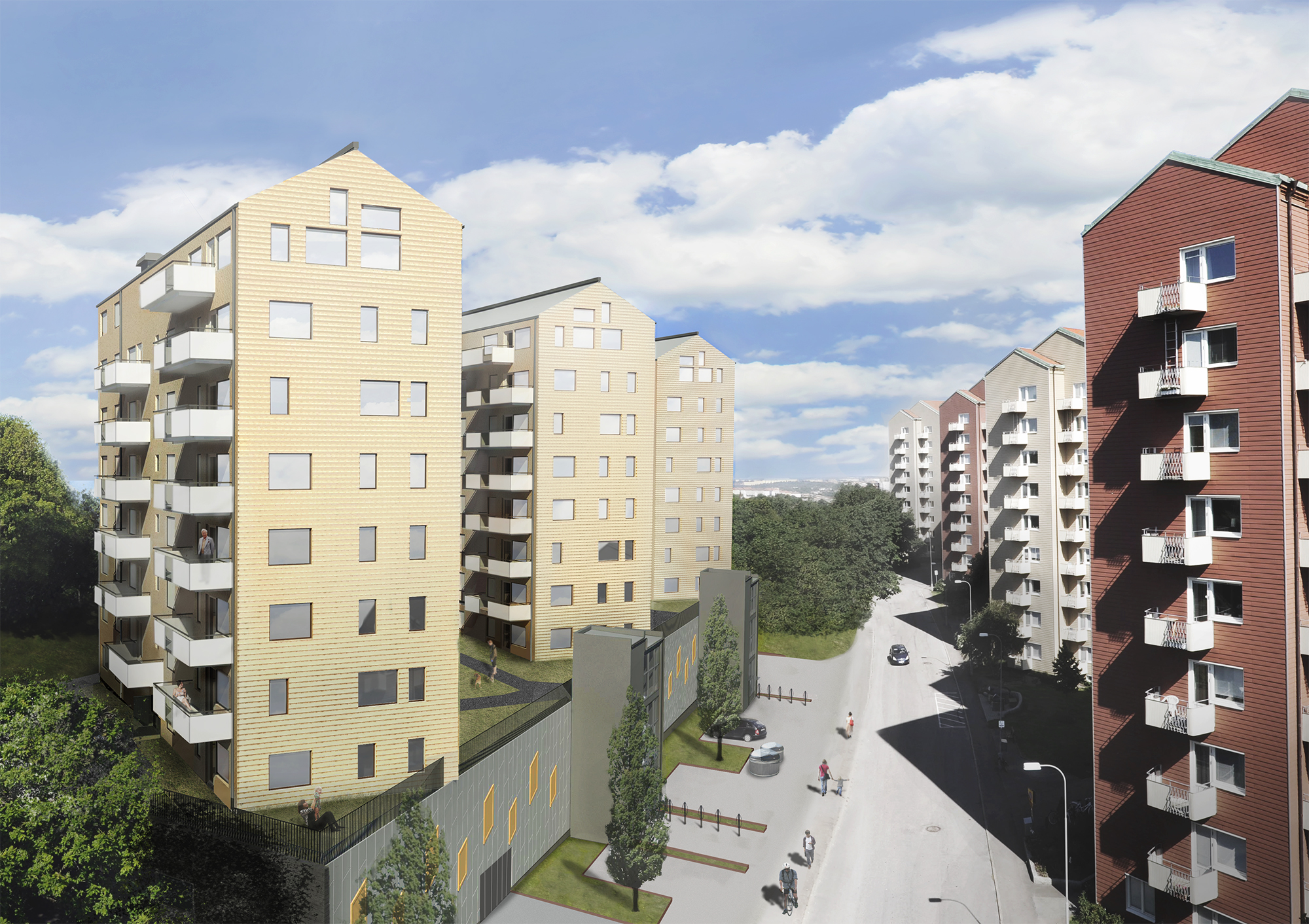 De tre smala lamellhusen ligger längst in på en lugn återvändsgata med skogs- och parkområden precis runt knuten. Tack vare att husen, med sina åtta våningar, byggs ovanpå ett nytt garage har alla lägenheter fin utsikt över omgivningarna.