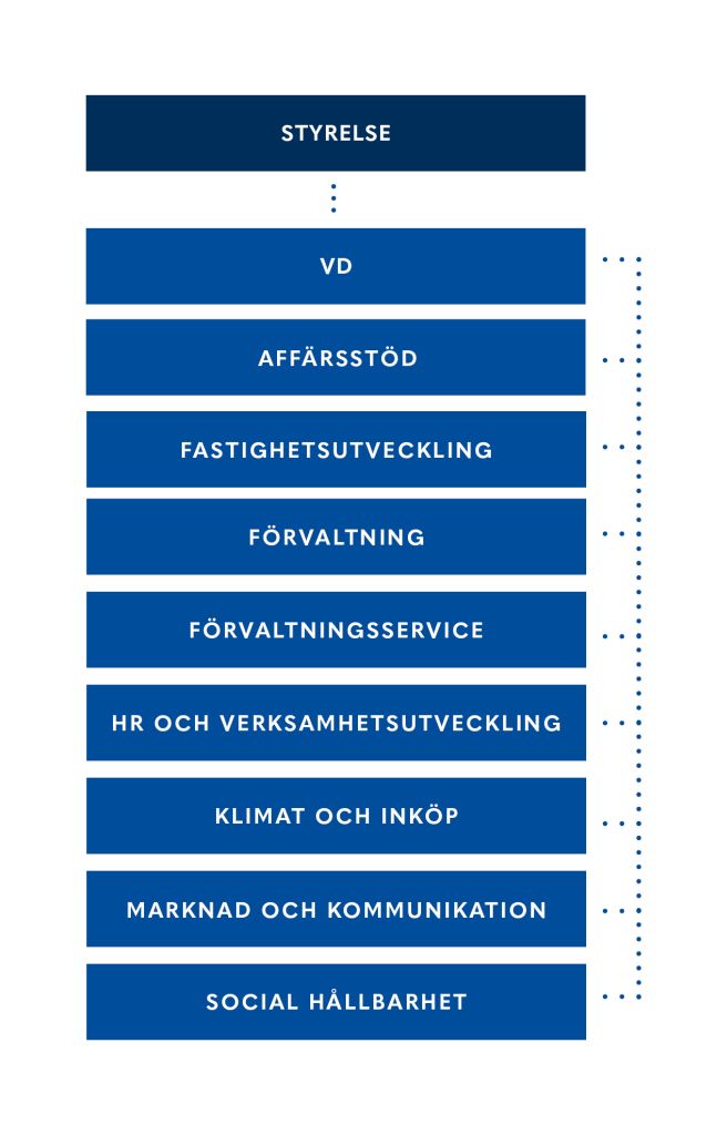 På Bostadsbolaget arbetar över 400 medarbetare med att skapa bra och trivsamma boendemiljöer för våra hyresgäster. Merparten arbetar nära hyresgästerna i våra bostadsområden. Den dagliga verksamheten styrs av Bostadsbolagets företagsledning och ytterst beslutande är styrelsen. Bostadsbolagets förvaltning ska bidra till nöjda och trygga hyresgäster genom en god boendemiljö och kundnära verksamhet.