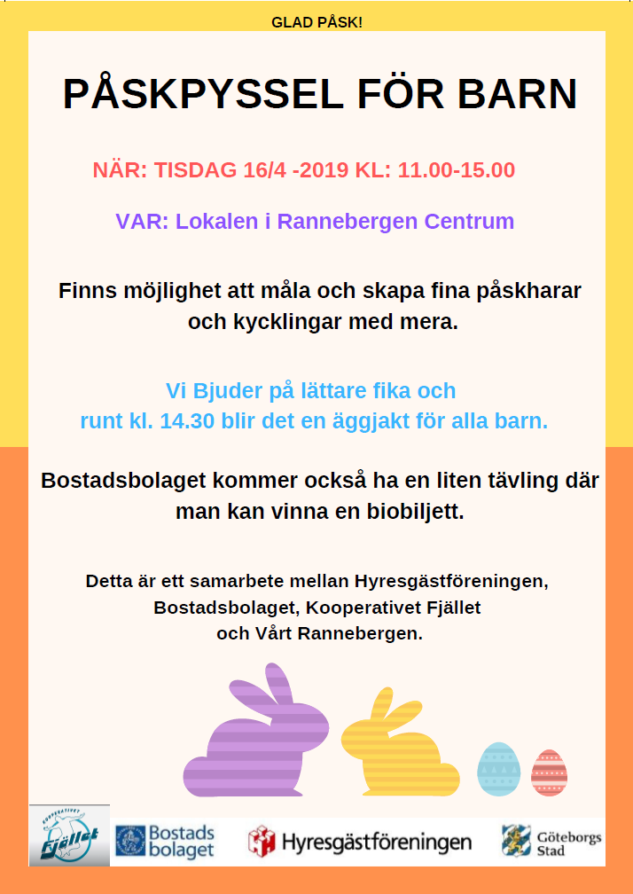 Tisdag den 16/4 klockan 11-15 anordnar vi påskpyssel för barnen i Rannebergen.