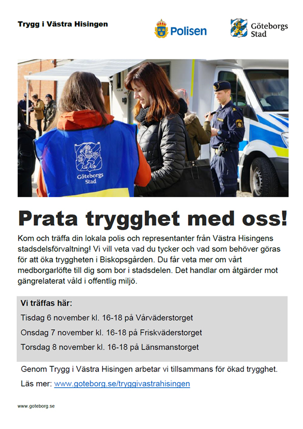 Den 6-8 november har du möjlighet att komma och prata trygghet med din lokala polis och representanter från Västra Hisingens stadsdelsförvaltning. Kom och berätta vad du tycker och vad som behövs göras för att öka tryggheten i Biskopsgården.