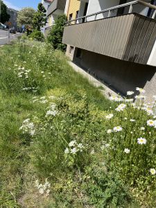 Du kanske undrar varför det ser ut så här på vissa plaster i området? Lugn, vi har inte glömt att klippa. Vi odlar äng för våra bin och insekter.