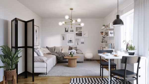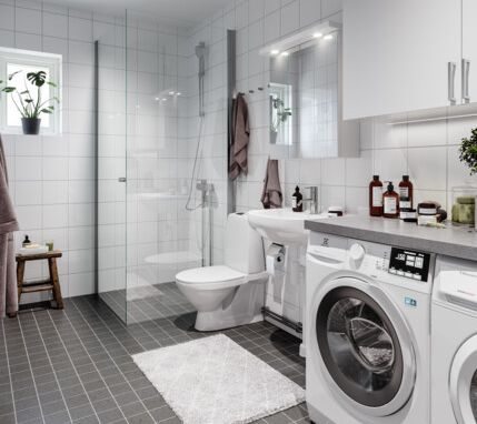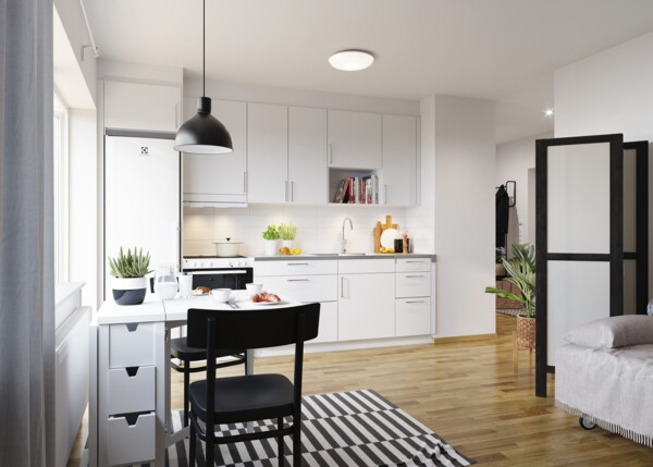 Rummen är målade i ljusa färger och på golven ligger ekparkett, utom i badrum och hall där det är klinker. Inredningsvalen är stilrena och klassiska för att hålla över tid och lägenheterna är förstås tillgänglighetsanpassade.