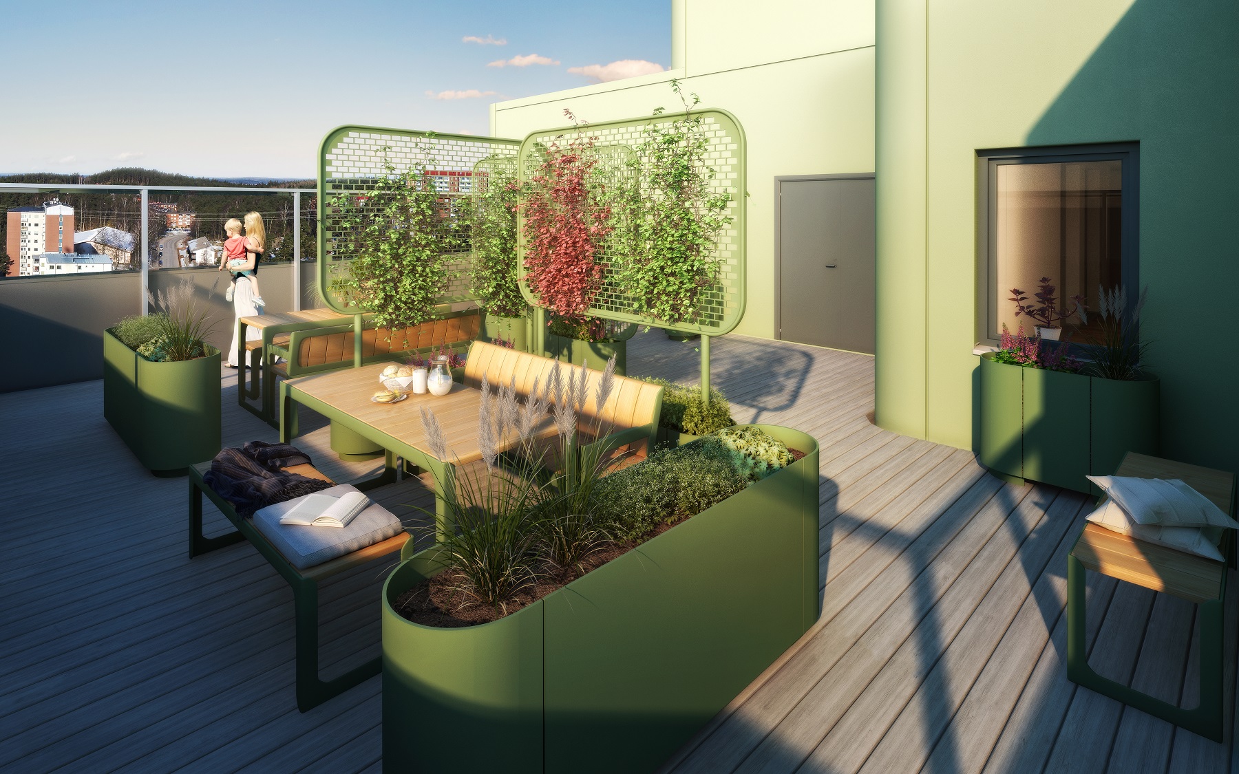 Lägenheterna är från ett till tre rum och kök, tillgänglighetsanpassade och med egen balkong, med undantag för en marklägenhet. Hela 16 våningar upp finns den gemensamma takterrassen som alla hyresgäster har tillgång till. En mötesplats för umgänge med grannar och vänner med milsvid utsikt åt alla väderstreck.