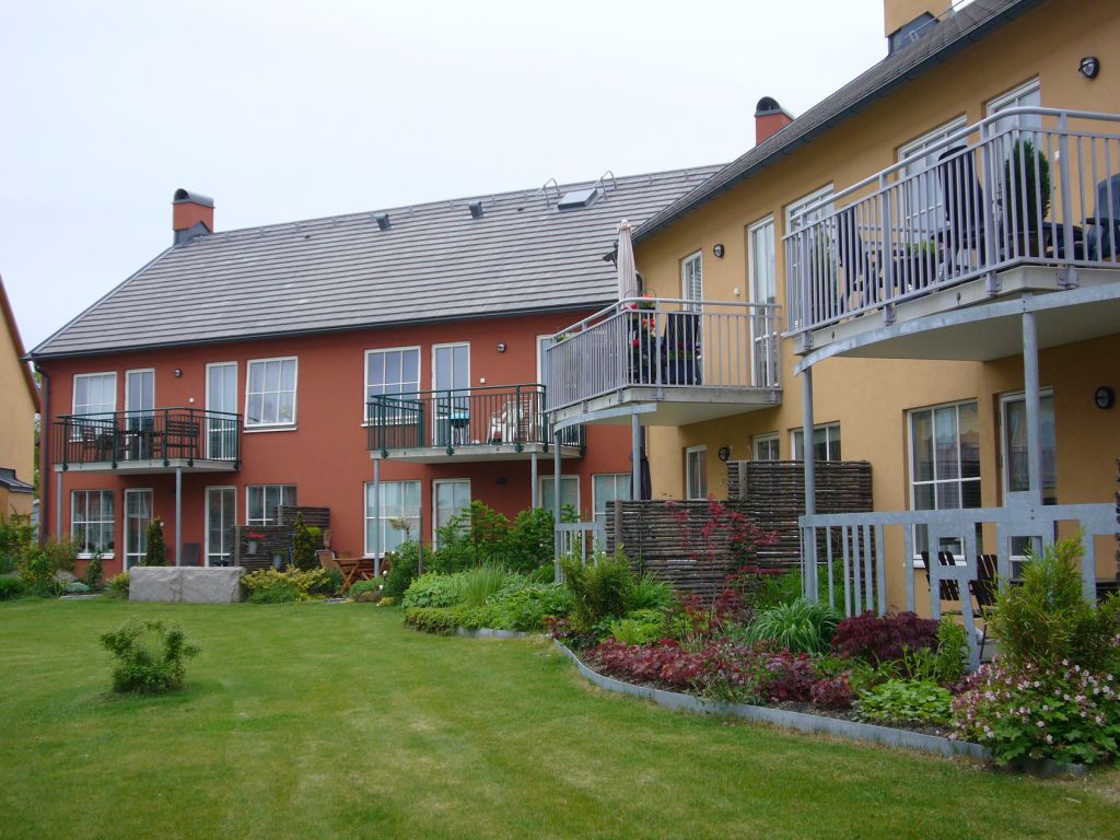Husen består av trä och puts i varma färger, två och en halv våning. Många lägenheter har uteplatser och bor man högre upp i huset har man balkong. Vi har två rum och kokvrå upp till fem rum och kök. Vanligast är treor. Alla lägenheter har egen tvättmaskin och torktumlare.