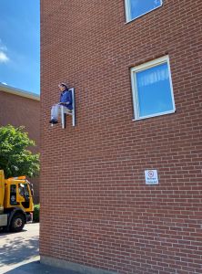 Konstutställningen x-times people chair fick människor att komma ut i området kring Brunnsbotorget. Alla var nyfikna och förvånade över att äldre personer satt på stolar som hängde på fasaderna.